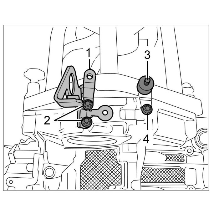 61. Remove oil pump with housing -1- by unscrewing two hexagon-head bolts (M6 x 80) -2- , two Torx screws (M6 x 20) -3- and (M10 x 100) -4-. Remove housing and ensure that the flange projection of the oil pump drive is not tilted. Replace the two O-rings during installation.