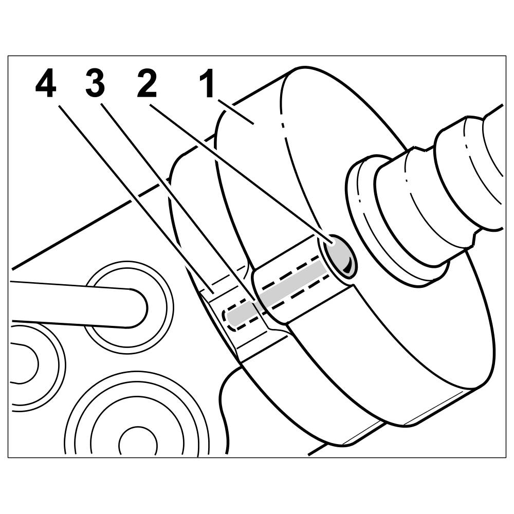 -3- is the desired breaking point for pins in new steering gears. The (new) pin -2- is inserted into the driver -1- and its underside sits in the lug -4-. This locks the steering gear in the centre position. After installation of a new steering gear, the lower part of the pin is sheared off (at the desired breaking point -3- ) by turning the steering wheel. The upper part of the pin -2- remains in the driver -1-.
