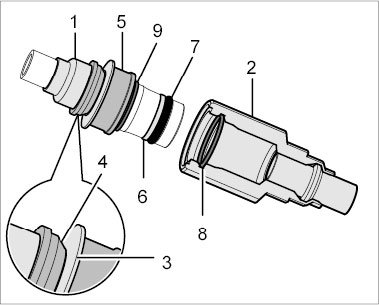 Pull on the connector -1- to check that the plug-in coupling is locked (push and pull slightly in axial direction). Counter at the plug-in sleeve -2- while doing this. If the plug-in coupling is locked correctly, you should be able to feel slight axial play between the connector -1- and plug-in sleeve -2-. A plug-in coupling cannot be partly locked. Another sure sign of a correctly locked plug-in coupling is the bulbous shape of the axial spring -5-.