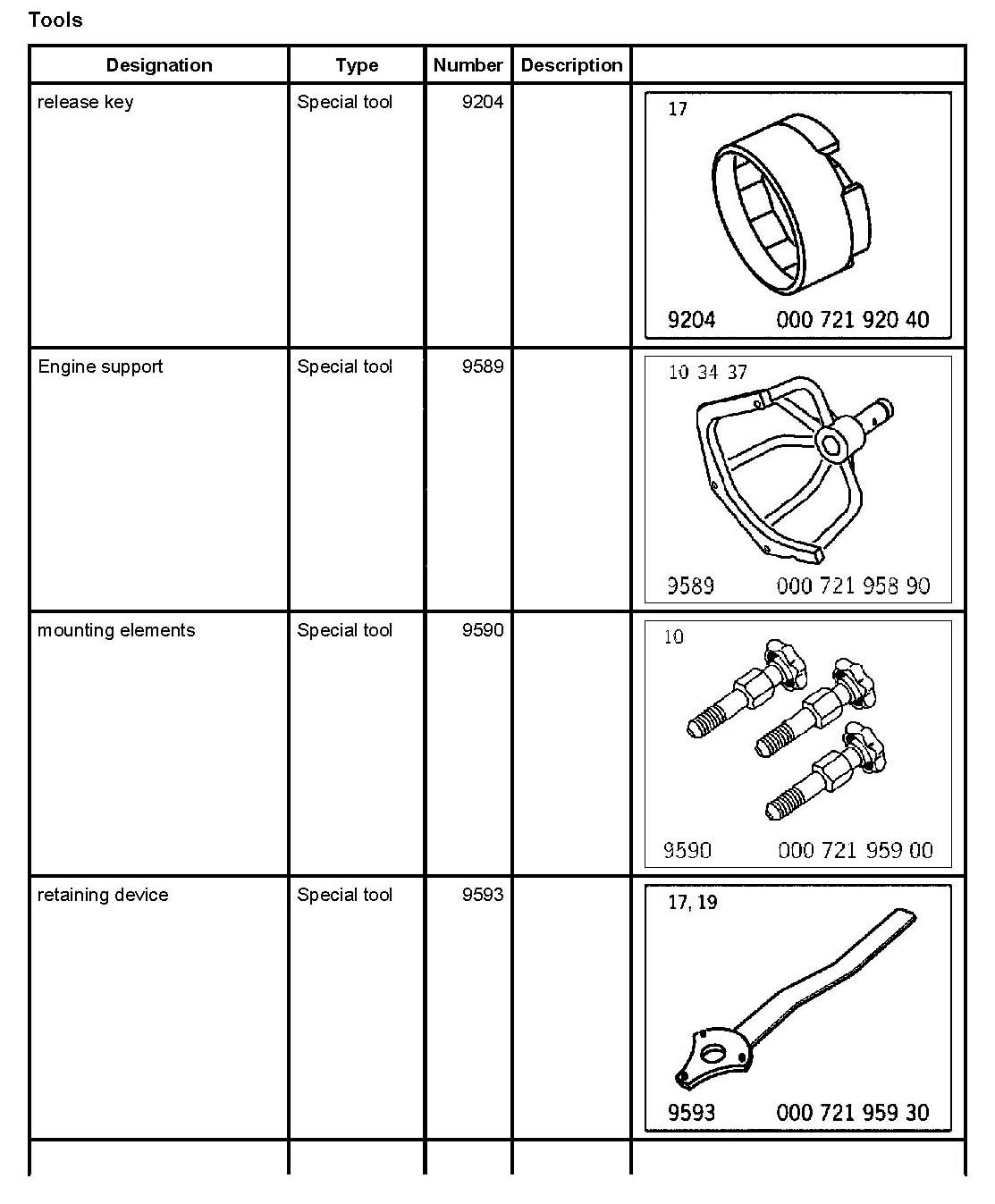 36. Remove crankshaft belt pulley by countering the belt pulley with special tool retaining device 9593 and screwing out central screw (M16 x 60).