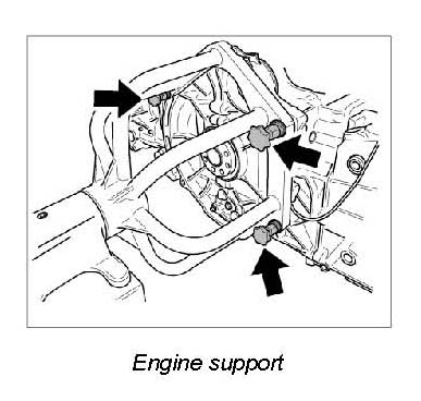 37. Remove engine mounting by unscrewing the three hexagon-head bolts (M10 x 120) and the hexagon-head bolt (M10 x 80). Only loosen the left upper hexagon-head bolt (M10 x 120); the hexagon-head bolt can be unscrewed after the engine mounting has been removed.