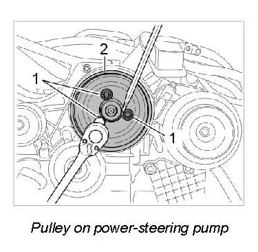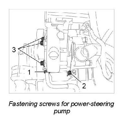 17. Remove power-steering pump with the lines by unscrewing three Torx screws (M8 x 30) -3- and the Torx screw (M8 x 12) -2-.