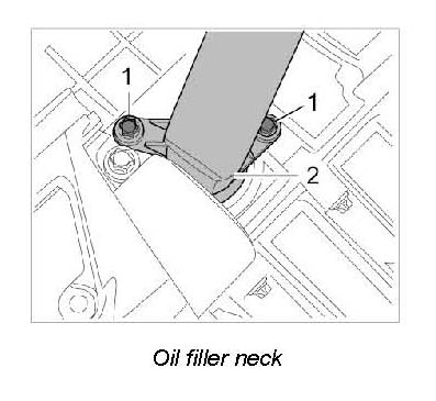 15. Remove oil filler neck -2- by unscrewing two Torx screws (M6 x 11) -1-. Replace O-ring and screws during installation.