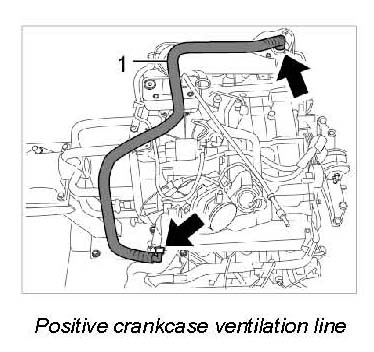 19. Remove the positive crankcase ventilation line -1- by releasing and disconnecting the rapid-action couplings -Arrows-. Replace O-rings during installation.