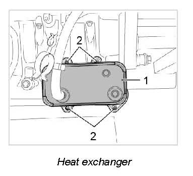 23. Remove oil-water heat exchanger -1- by unscrewing four Torx screws (M6 x 16) -2-. Replace all O-rings during installation.