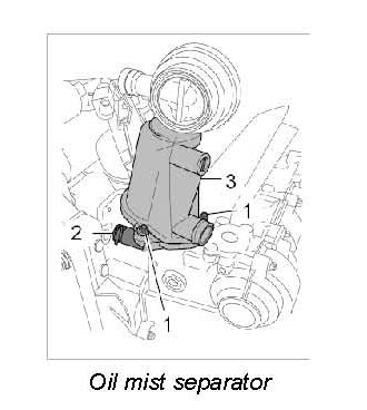24. Remove oil mist separator -3- by unscrewing two Torx screws (M6 x 20) -1- and loosening the spring band clamp -2-. Pull oil mist separator -3- from the cylinder head and pull off the hose. Replace O-ring during installation.