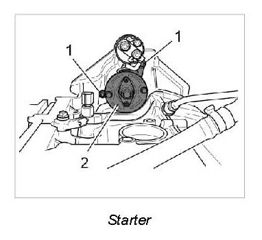 27. Remove starter -2- by unscrewing two Torx screws (M10 x 35) -1-.