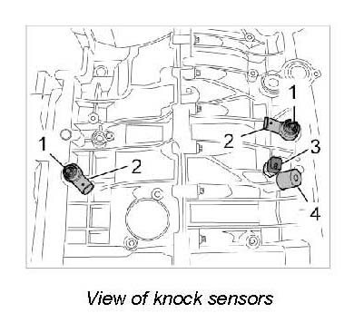28. Remove knock sensors -2- by unscrewing one Torx screw (M8 x 35) on each -1-. Mark the position of the electric connection for re-installation.
