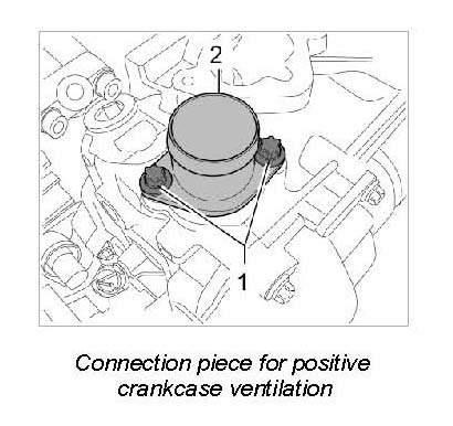 32. Remove connection piece for positive crankcase ventilation -2- by unscrewing two Torx screws (M6 x 11) -1-. Replace O-ring during installation.