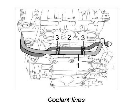 42. Remove coolant lines -1- and -2- by unscrewing two Torx screws (M6 x 16) -3-.