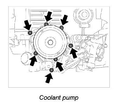 43. Remove coolant pump by unscrewing six hexagon-head bolts (M6 x 25, M6 x 30) -Arrows-. Replace metal seal during installation.
