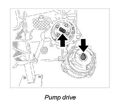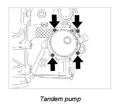 45. Remove tandem pump by unscrewing four Torx screws (micro-self-locking, M6 x 30) -Arrows-. During installation, note the position of the pump drive with respect to the groove on the camshaft sprocket. Both parts must be in line in installation position. Otherwise the pump drive must be rotated. Replace O-ring and screws during installation.