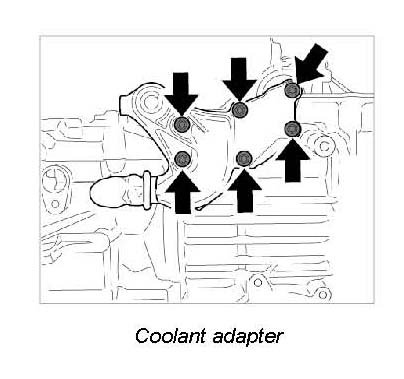 47. Remove coolant adapter by unscrewing six Torx screws (M6 x 20) -Arrows-. Replace metal seal during installation.
