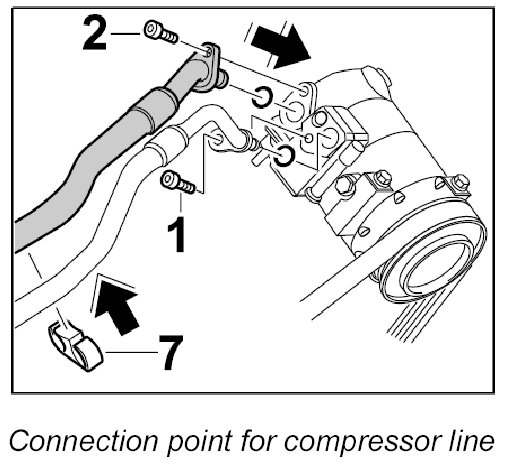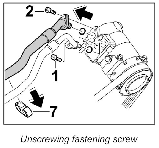 3. Unscrew the refrigerant line between the compressor and condenser at the connection points on the compressor and on the condenser and disconnect it.