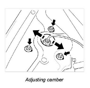 The camber is adjusted by moving the spring strut transversely. For this purpose, undo the three fastening nuts on the spring-strut mount and, to move the spring strut, remove the covering cap on the piston rod.