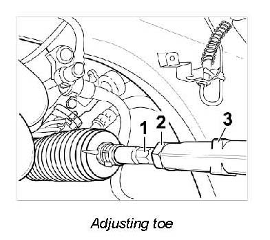 Loosen tie rod lock nut(s) -2-. When loosening and tightening the tie rod lock nut(s) counter on the square of the tie rod -3-, with an open-ended wrench. Then adjust the toe on the hexagon -1- of the tie rod(s). Then tighten the tie rod lock nut(s) -2- to the prescribed tightening torque.