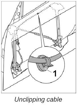 4. Fold power windows -1- together and remove through the door opening -arrow-.