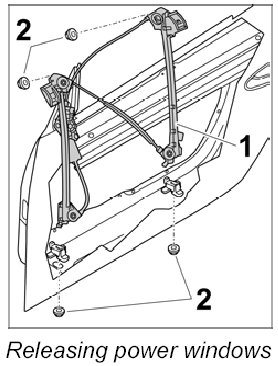 3. Unscrew fastening nuts -2- on power windows -1-.