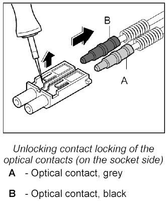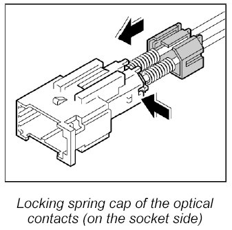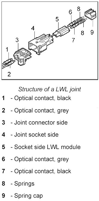 The LWL is delivered with affixed plastic contacts. These contacts are latched in the connector housing in the case of repairs. Grey and black contacts with identical mechanical dimensions are used.