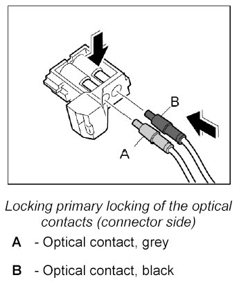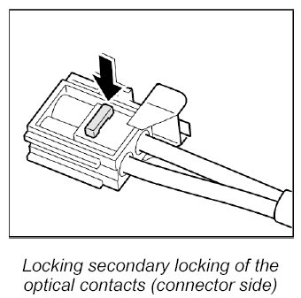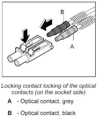 The LWL and the plug connections must not come into contact with fluids such as water, creeping compound, preservative, anti-freeze protection, cleaning agent. They will impair the MOST system function or cause complete system failure. Even plug connectors with plugged-in protective caps must not come into contact with the fluids listed.