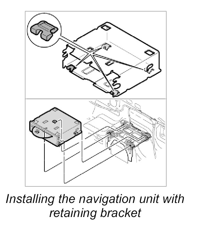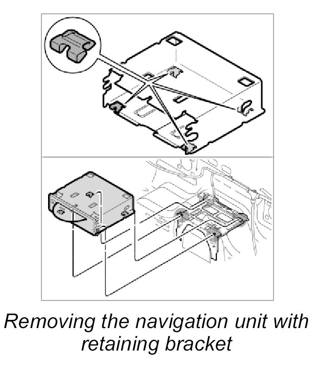 - If the navigation unit is removed with the retaining bracket, then new clips must be used before reinstallation.