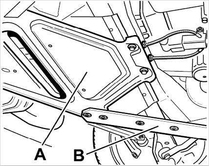 3. Remove right and left diagonal braces -B- and the support plate -A-. Pull out the support plate -A- without undue force.