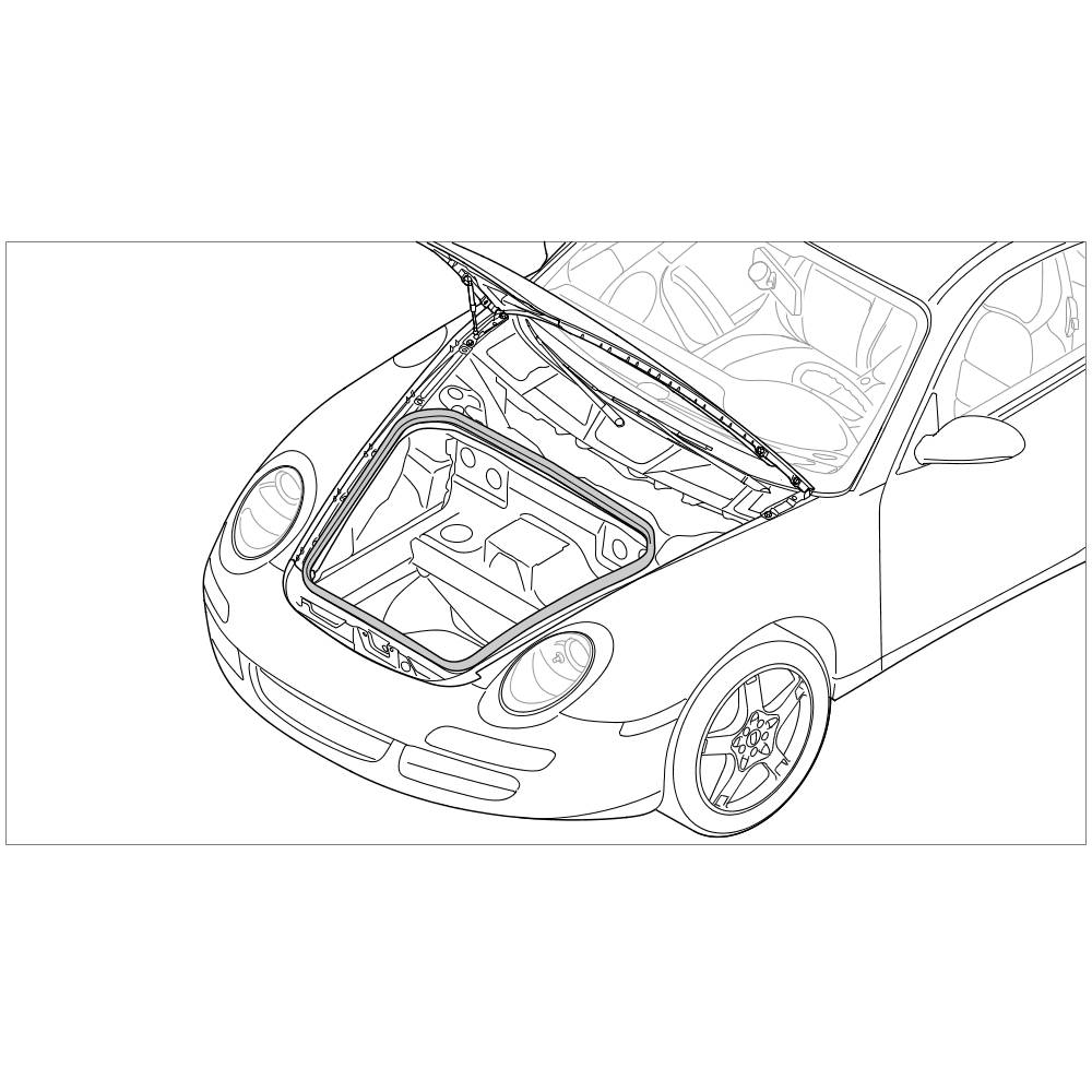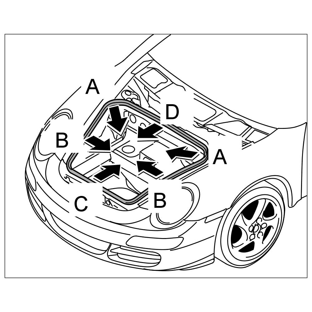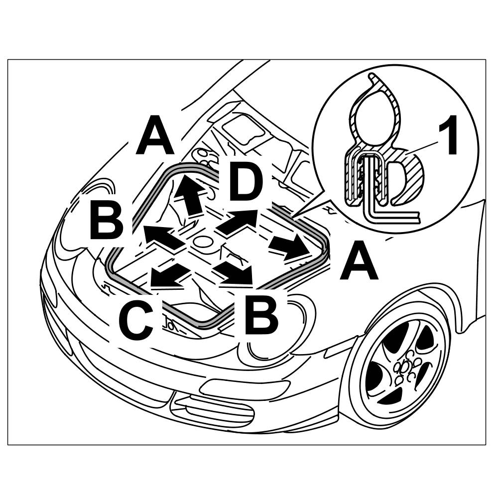 2. Apply the seal evenly along the flange. Position and press the seal without any tension on the flanges to the wing -B- , to the closing panel -C- and to the radiator tank cover -D-.
