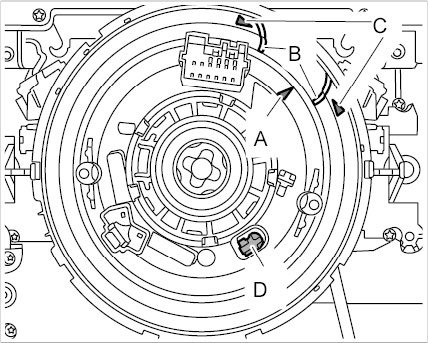 Ensure that arrow -A- on the rotor is positioned between the markings -B- of the arrows -C- on the airbag contact unit and that the locking element -D- is engaged.