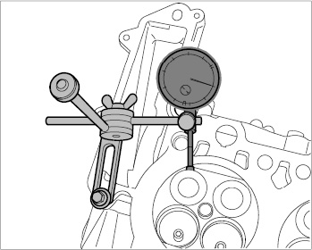 2. Check valve tilt play on intake valve. Adjust the dial gauge to the relevant angle of the valve to be checked and set to '0' with preload. Press valve disc towards dial gauge and pull it back again. Read off value and note it.