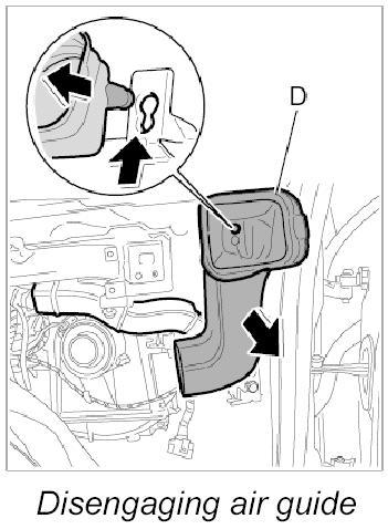 2. If the air guide -D- has to be removed, first remove the air vent at the right door window.