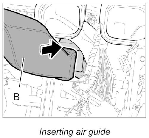 1. Insert the air guide -B- into the heating/air-conditioning unit and check that it is secure.