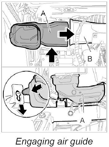 3. Slide the air guide -A- into the air guide slot -B- and engage air guide -A- at the mounting bracket.
