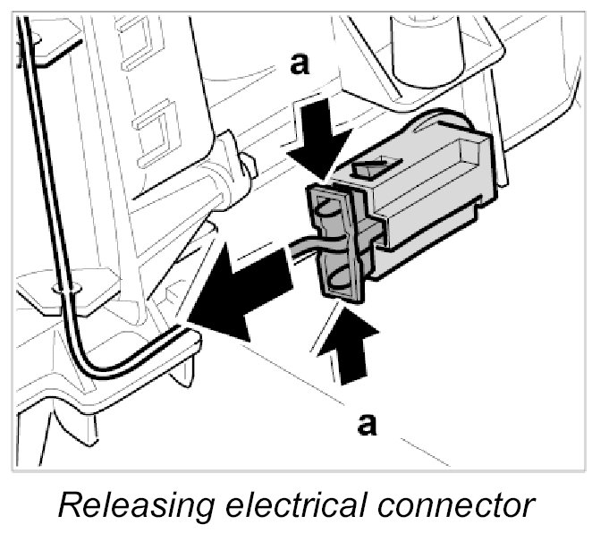 2. From the driver's side, reach around to the "driver's footwell" air vent to release and disconnect the electrical connector -a-.