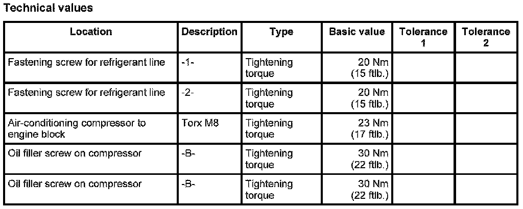 9. Screw in rear Torx screw for air-conditioning compressor (M8 x 120) -1-and tighten all three screws for air-conditioning compressor. - Tightening torque: 23 Nm (17 ftlb.).