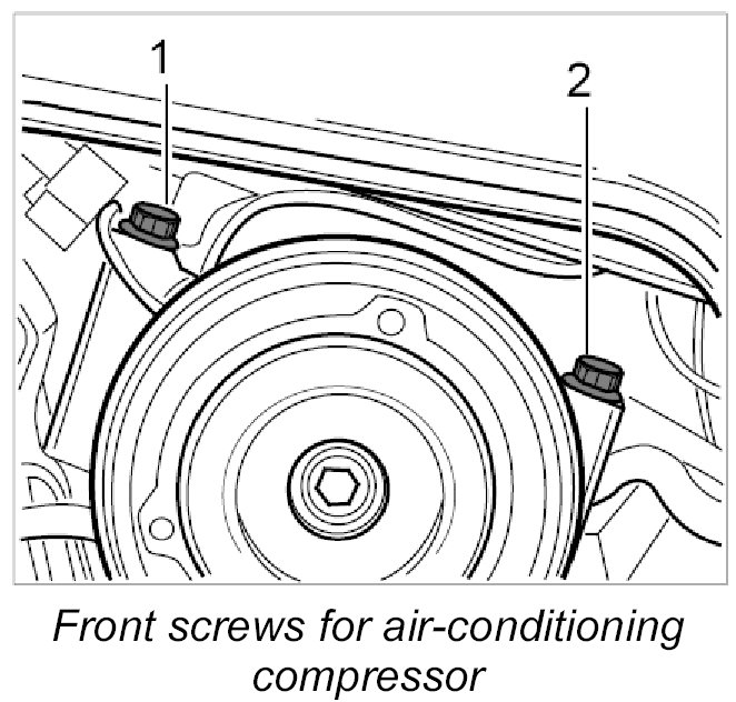 8. Screw in front Torx screws for air-conditioning compressor (M8 x 90) -1-and -2-.