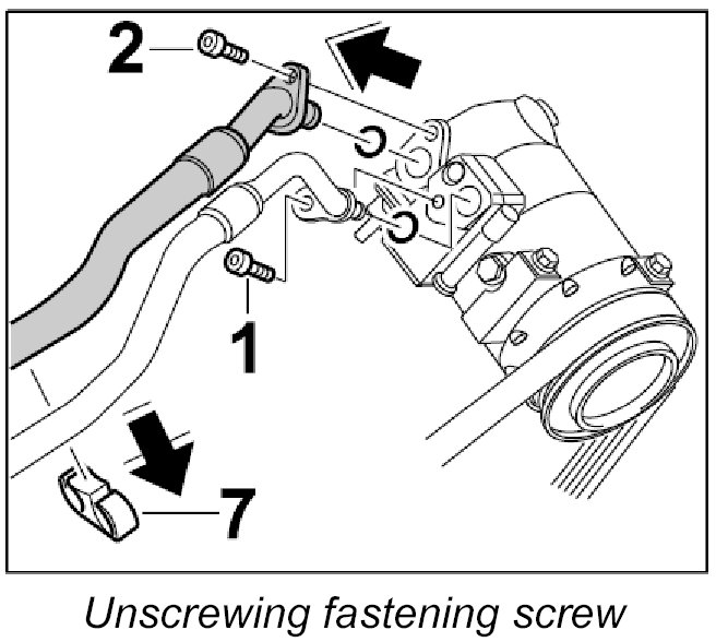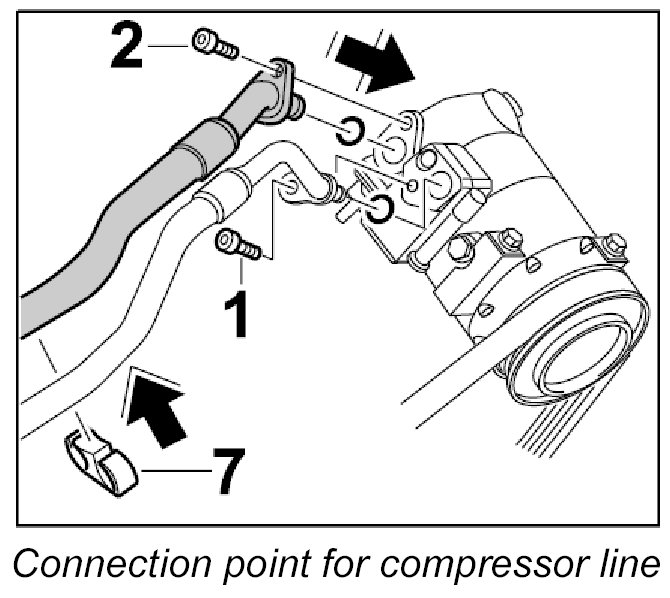 3. Unscrew the refrigerant line between the compressor and condenser at the connection points on the compressor and on the condenser and disconnect it.