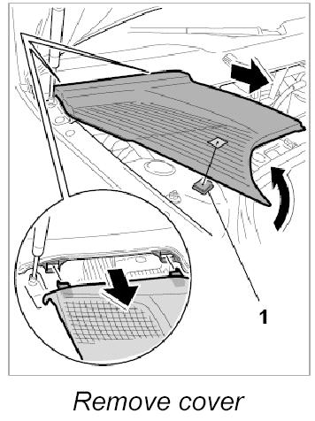 1. Lift rubber lip of luggage compartment seal to one side, lift up the cover and disengage it from cowl panel cover.