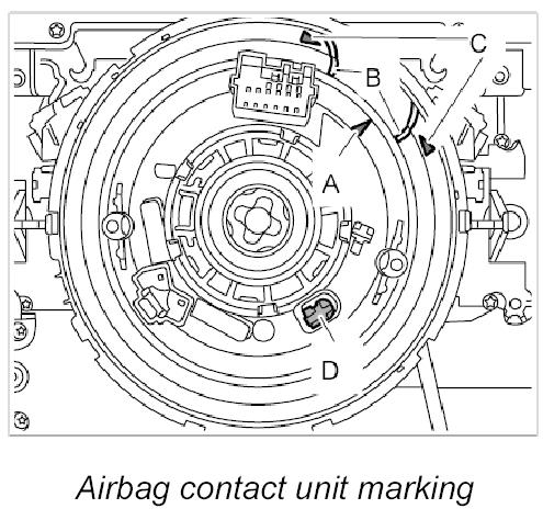 INFORMATION: Ensure that arrow -A- on the rotor is positioned between the markings -B- of the arrows -C- on the airbag contact unit and that the locking element -D- is engaged.