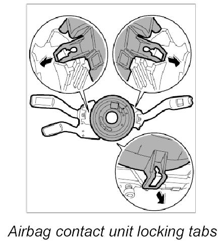 1. Carefully lift up the three retaining tabs and remove airbag contact unit -C-.