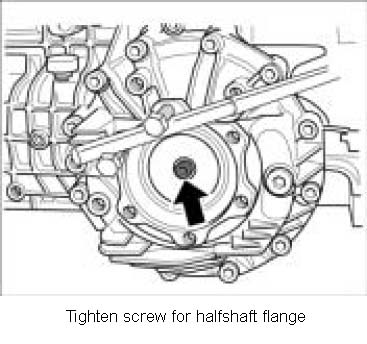 6. Screw in fastening screw for halfshaft flange. For this purpose, screw in two drive shaft screws to counter and tighten fastening screw.