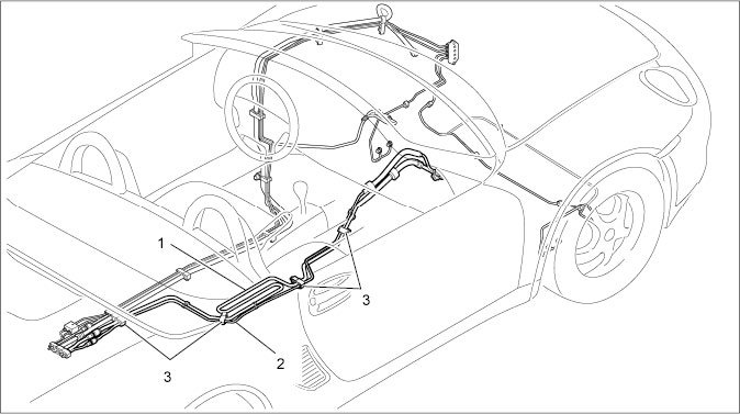 The steering pressure line -2- is fitted on the steering gear and also on the plug-in coupling (connection point) in the rear sill area.