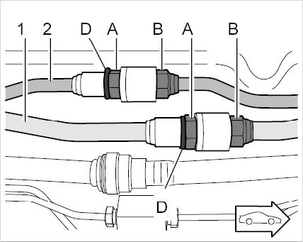 Remove circlip -D- from the pressure line (thinner line) -2-. Loosen (unscrew) the plug-in coupling. When loosening the threaded joint -A-, turn and counter at the hexagon on the plug in coupling -B-.