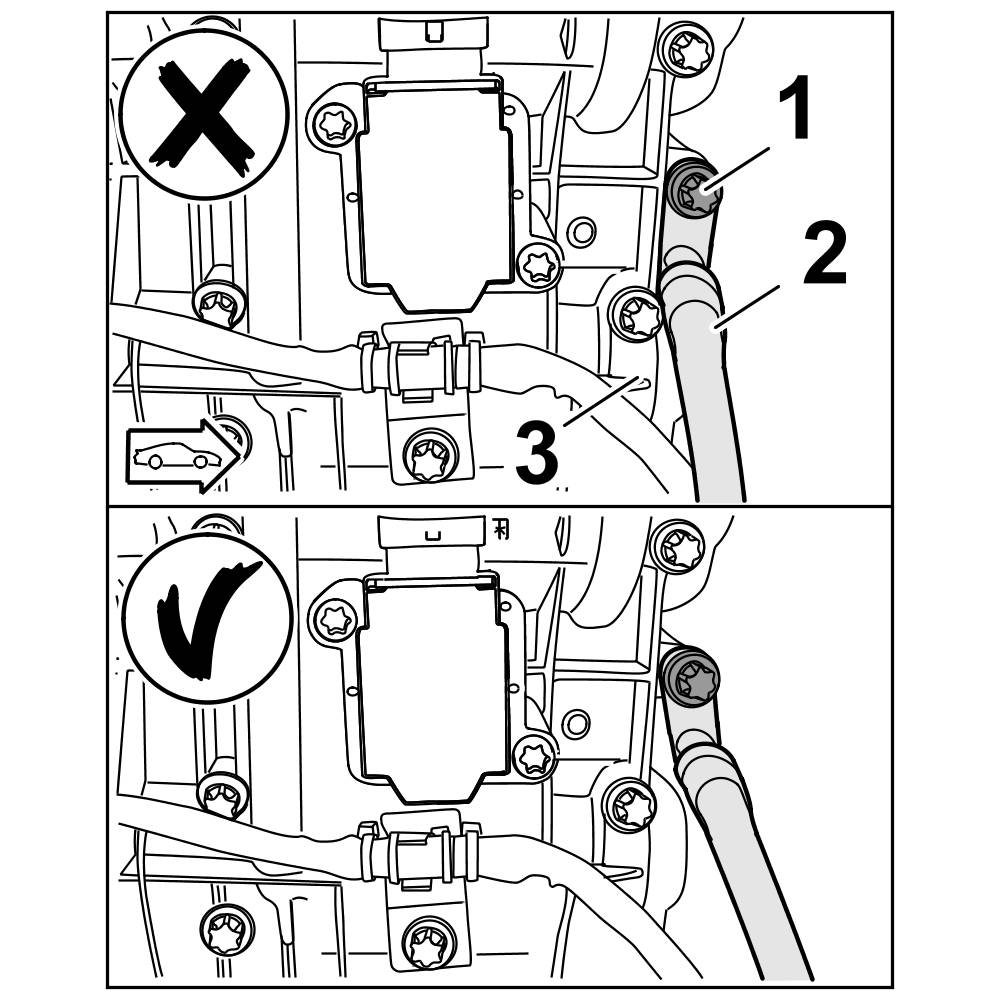 1. Loosen fastening screw -1- slightly. Fit ground strap -2- in the bracket so that there is no contact with the valve cover -3-.