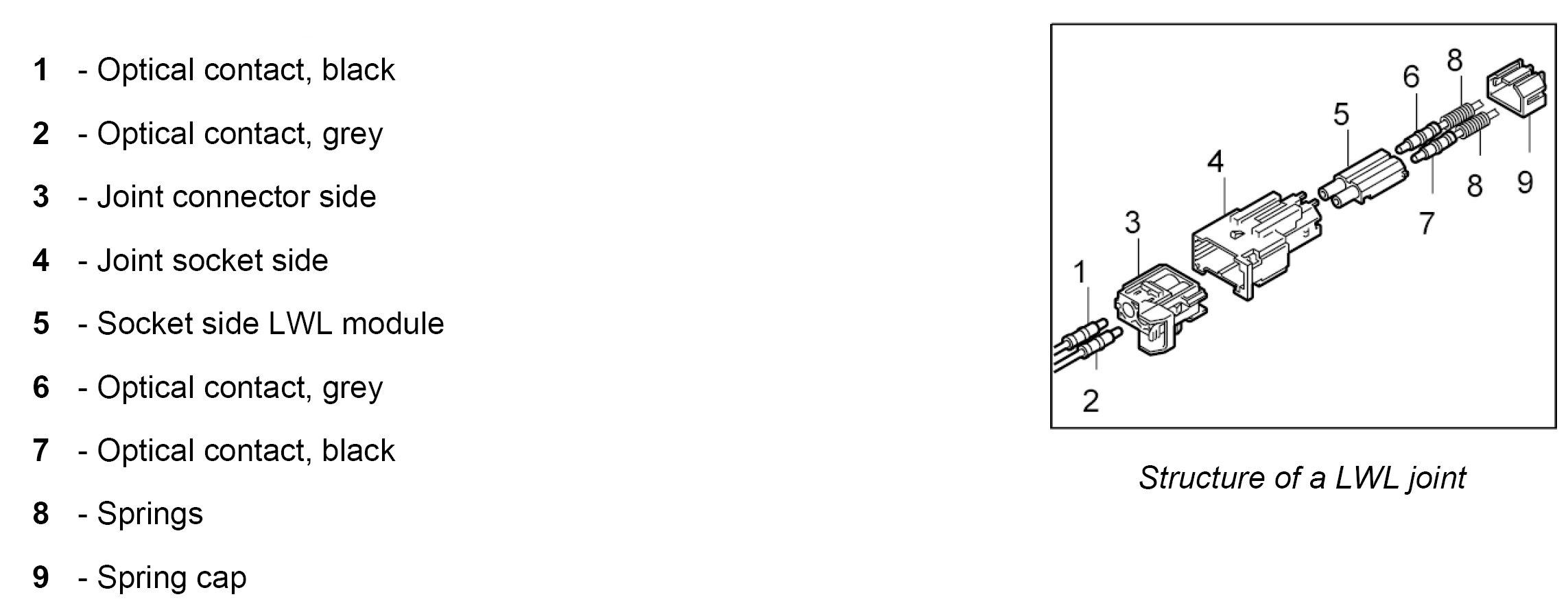 The LWL and the plug connections must not come into contact with fluids such as water, creeping compound, preservative, anti-freeze protection, cleaning agent. They will impair the MOST system function or cause complete system failure. Even plug connectors with plugged-in protective caps must not come into contact with the fluids listed.
