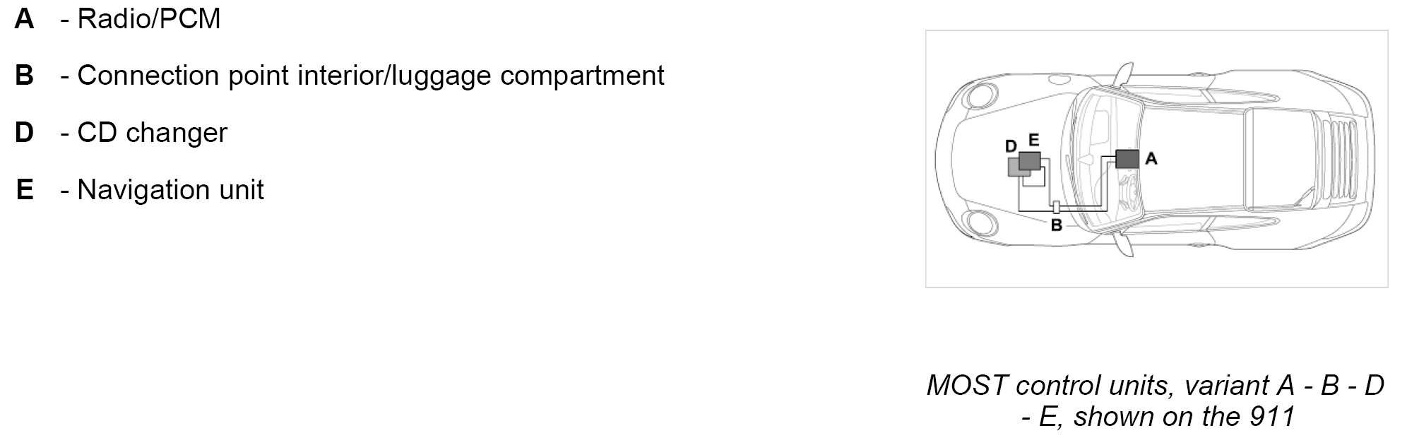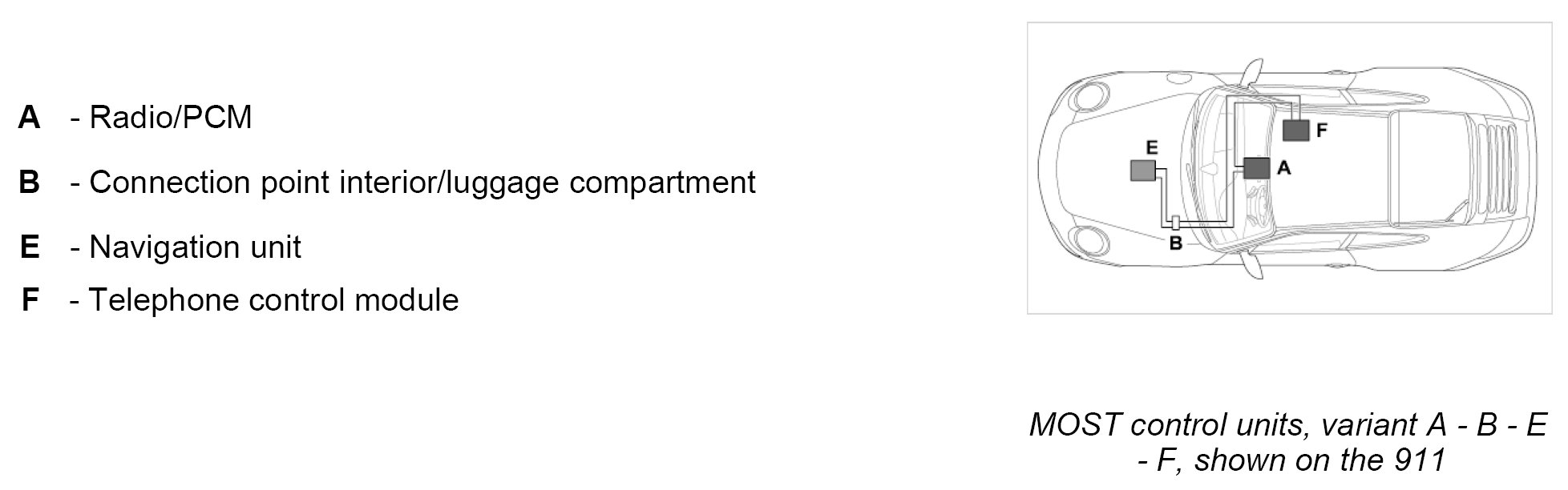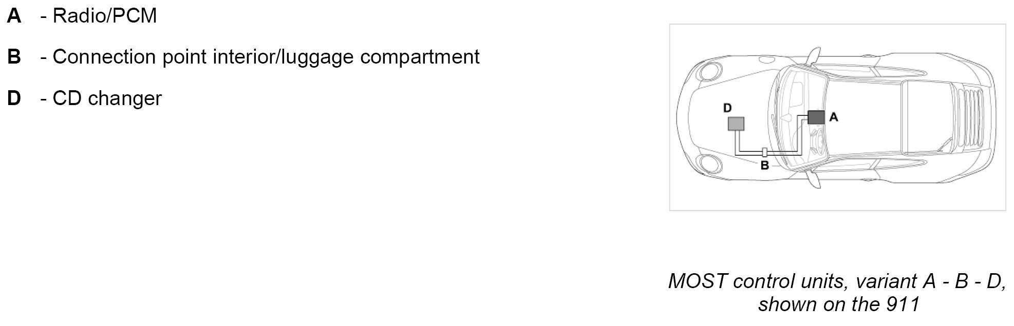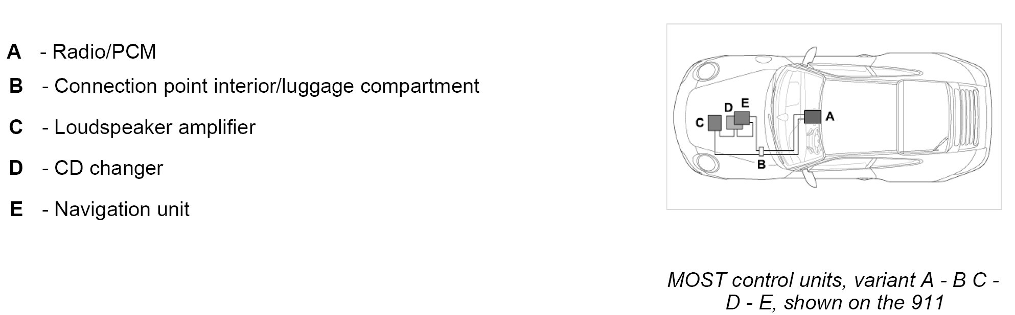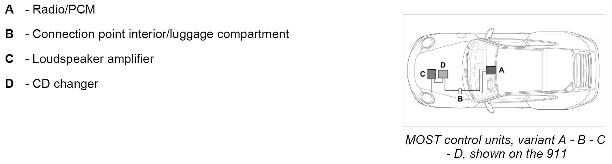 The graphic clarifies the cabling of the individual MOST control units which vary according to their equipment.