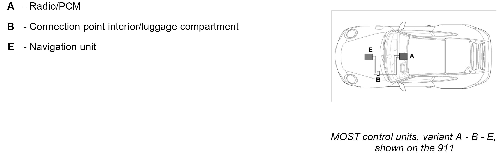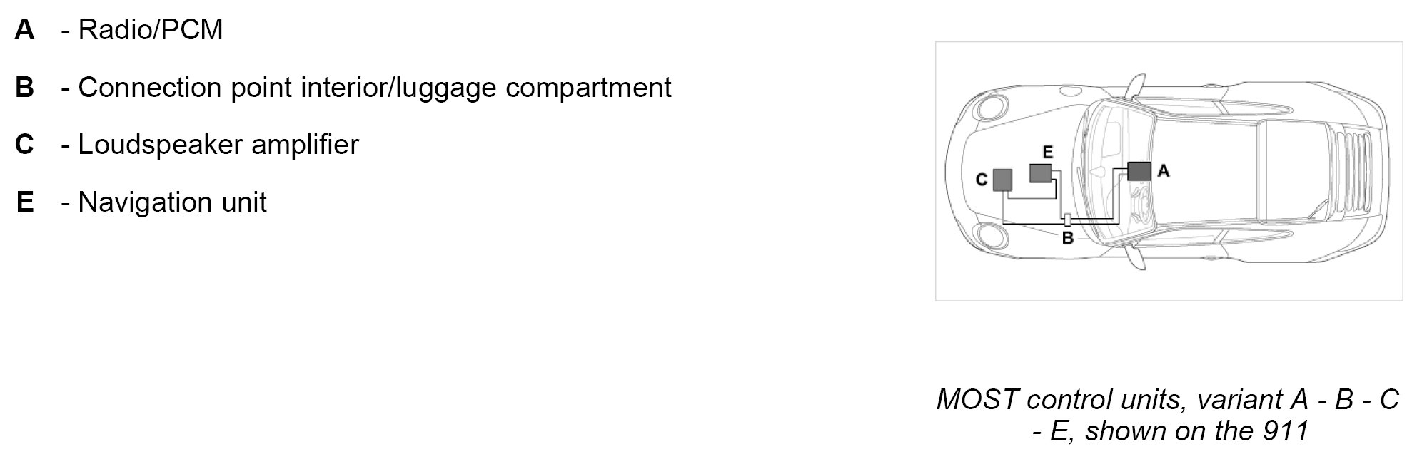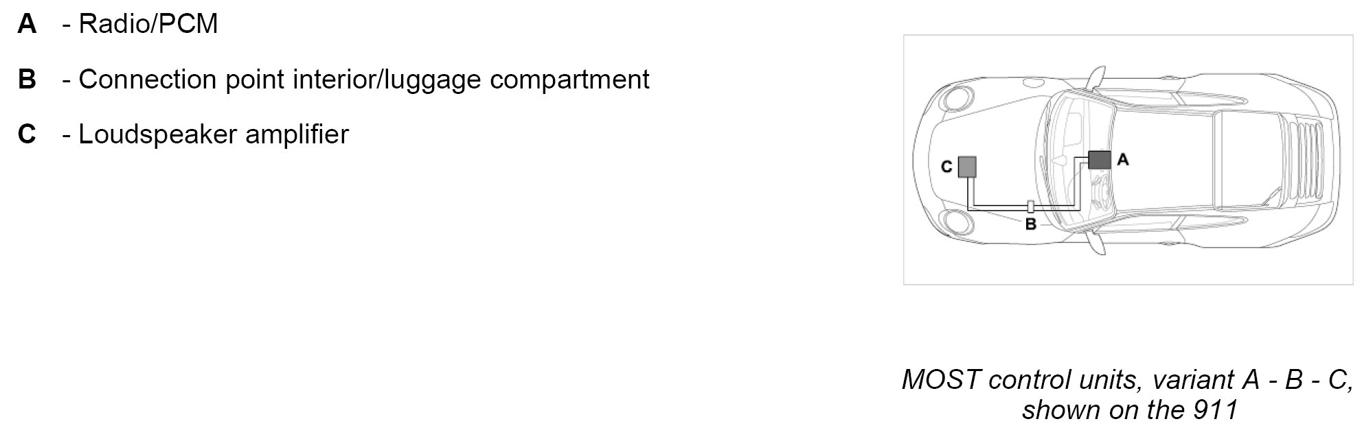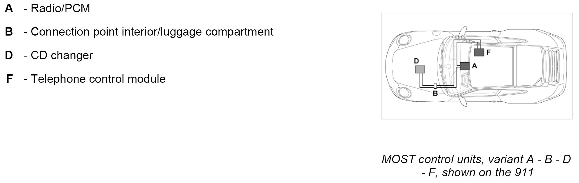 The graphic clarifies the cabling of the individual MOST control units which vary according to their equipment.