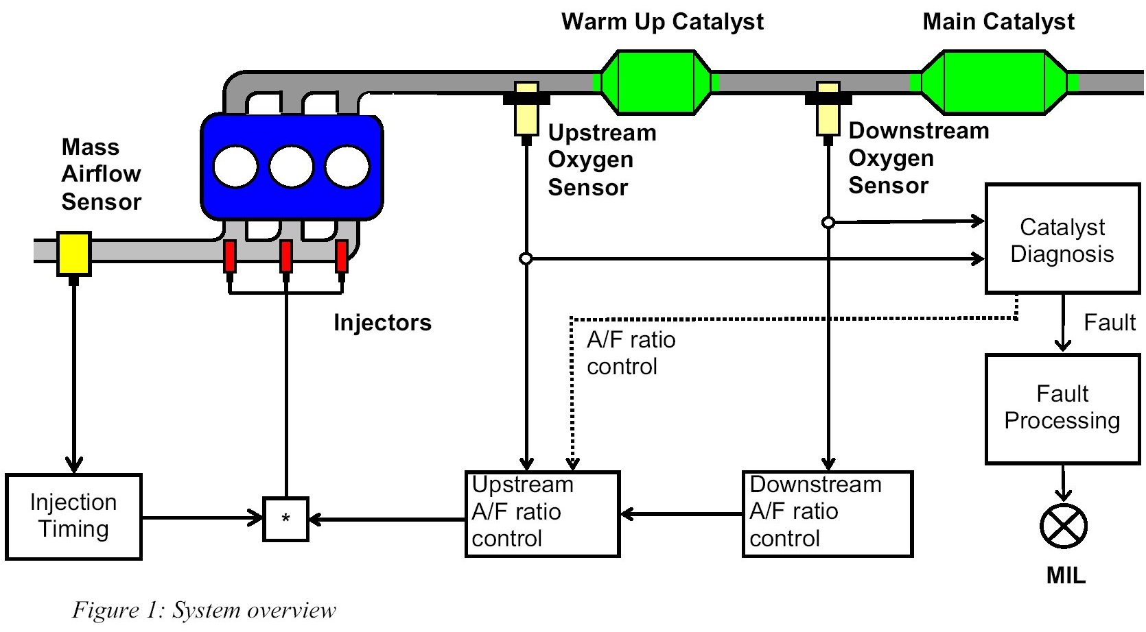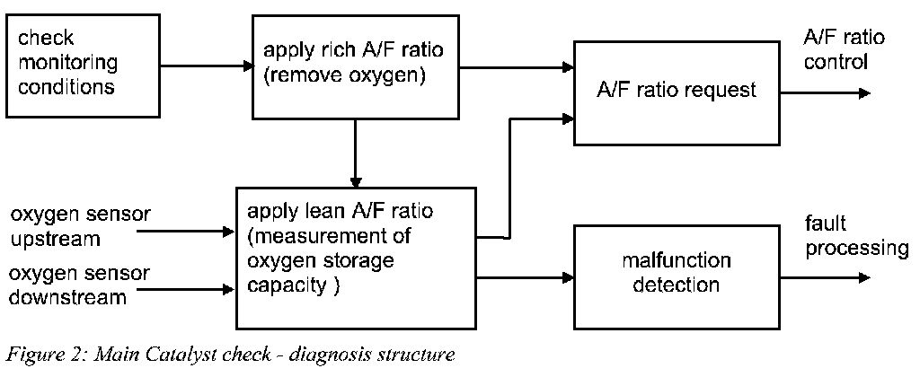 The main catalyst check is based on the direct measurement of the catalyst's OSC during the transition from a rich to a lean air-fuel mixture. The required set up is depicted in figure 1. The air-fuel ratio can be precisely determined with the upstream wide band oxygen sensor. The downstream oxygen sensor delivers information about the OSC of the catalyst.