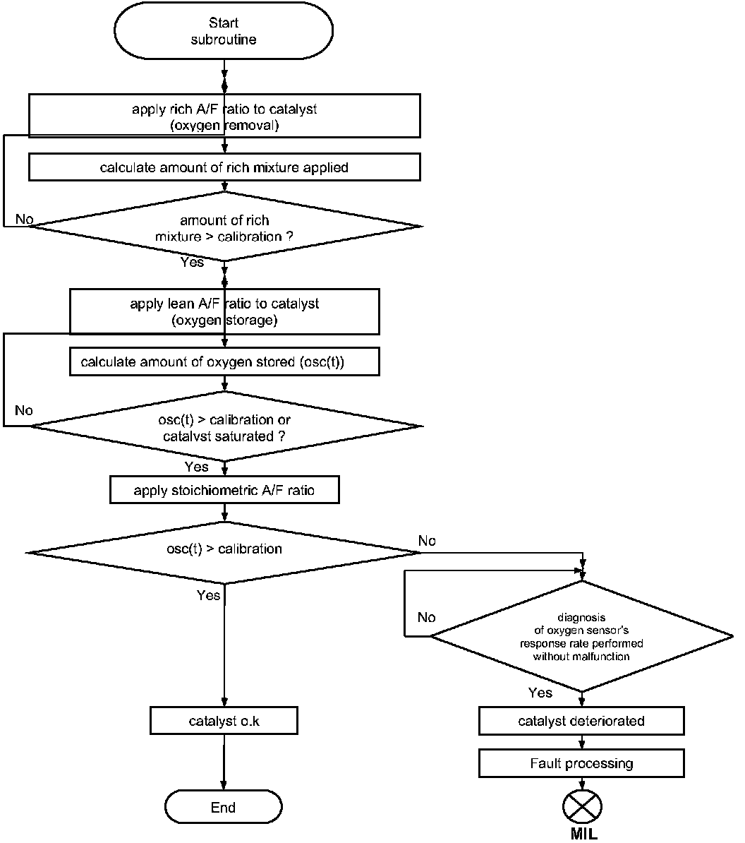 The diagnosis of the catalyst directly determines the OSC (oxygen storage capacity) of the catalyst and compares the result with the oxygen storage capacity of a modeled borderline catalyst (catalyst deteriorated to the malfunction criteria). The nonlinear correlation between conversion efficiency and oxygen storage capacity has been shown in various investigations.