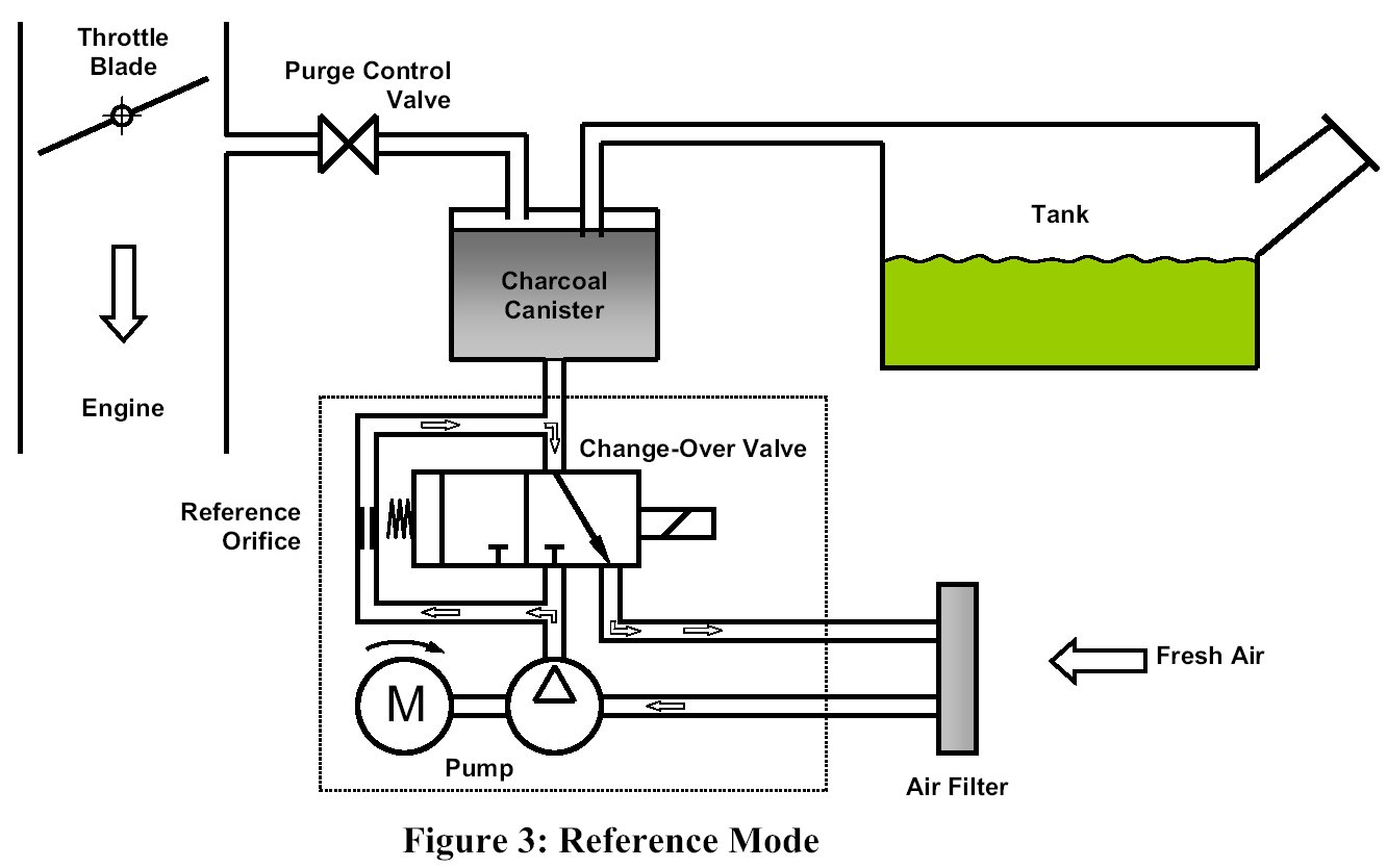 The DM-TL (Diagnostic Module Tank Leakage) is used for monitoring the evaporative system for small (> 0.02 in) and rough (> 0.04 in) leaks. It consists of an electrically driven air pump, a change-over valve and a 0.02 inch orifice for reference measurement - see Fig. 1. The tightness of the tank system is obtained by comparing the actual air pump's motor current with that measured when the system is operated with a standardized reference orifice.