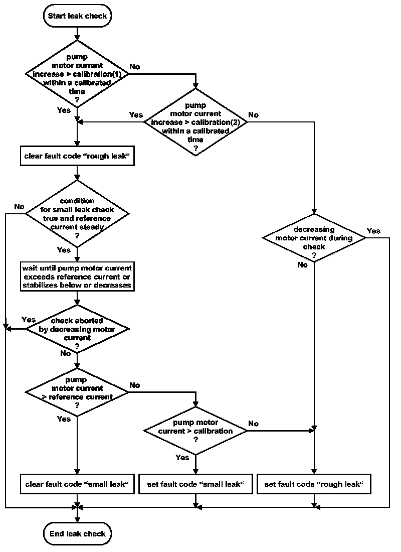 The small leak check is performed if and only if the rough leak check has been performed and no rough leak was detected. If the enable conditions for the small leak check (> 0.02 in) are fulfilled, the pump's motor remains in the active state (monitoring mode) until its current exceeds the reference current, or the motor current gradient is close to zero (current stabilizes below the reference current). If the motor current exceeds the reference current, the evaporative system is considered as tight. A small leak is assumed only if a second small leak check confirms a current stabilization below the reference current.